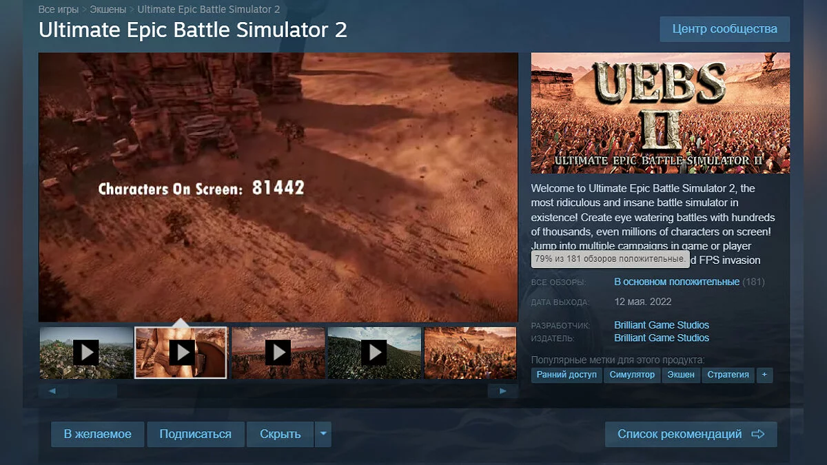 В раннем доступе Steam вышел симулятор масштабных битв под названием Ultimate Epic Battle Simulator 2, у которого, на момент написания новости, в основном положительные отзывы (рейтинг 79%). Большинству геймеров понравился проект.