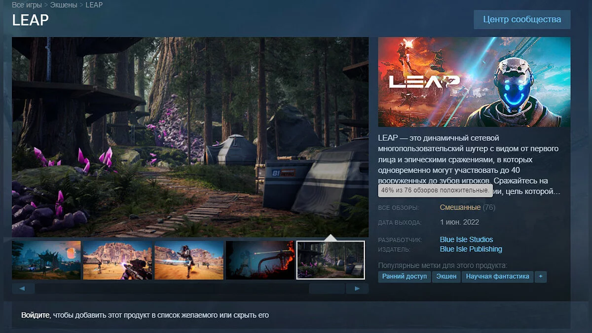 В раннем доступе Steam вышел динамичный научно-фантастический шутер от первого лица под названием LEAP, который предлагает многопользовательские сражения с поддержкой до 40 игроков. За сутки игра получила смешанные отзывы от геймеров. Так, к примеру, на момент написания новости рейтинг проекта составляет всего 46%.
