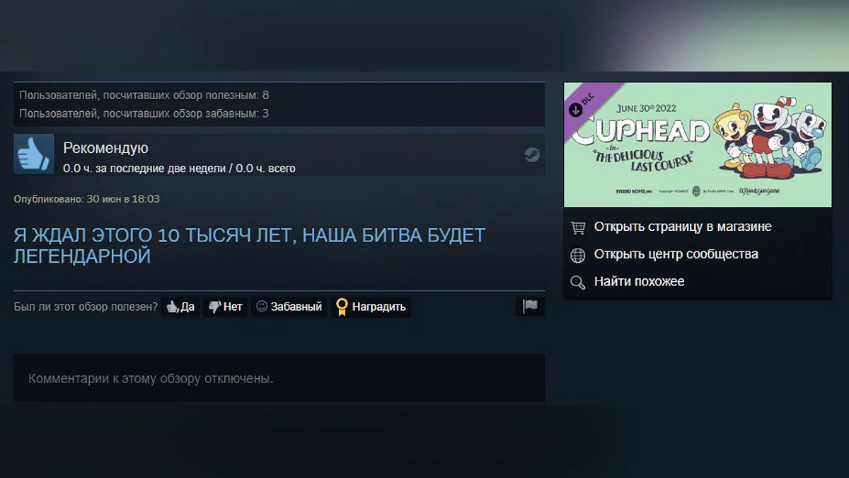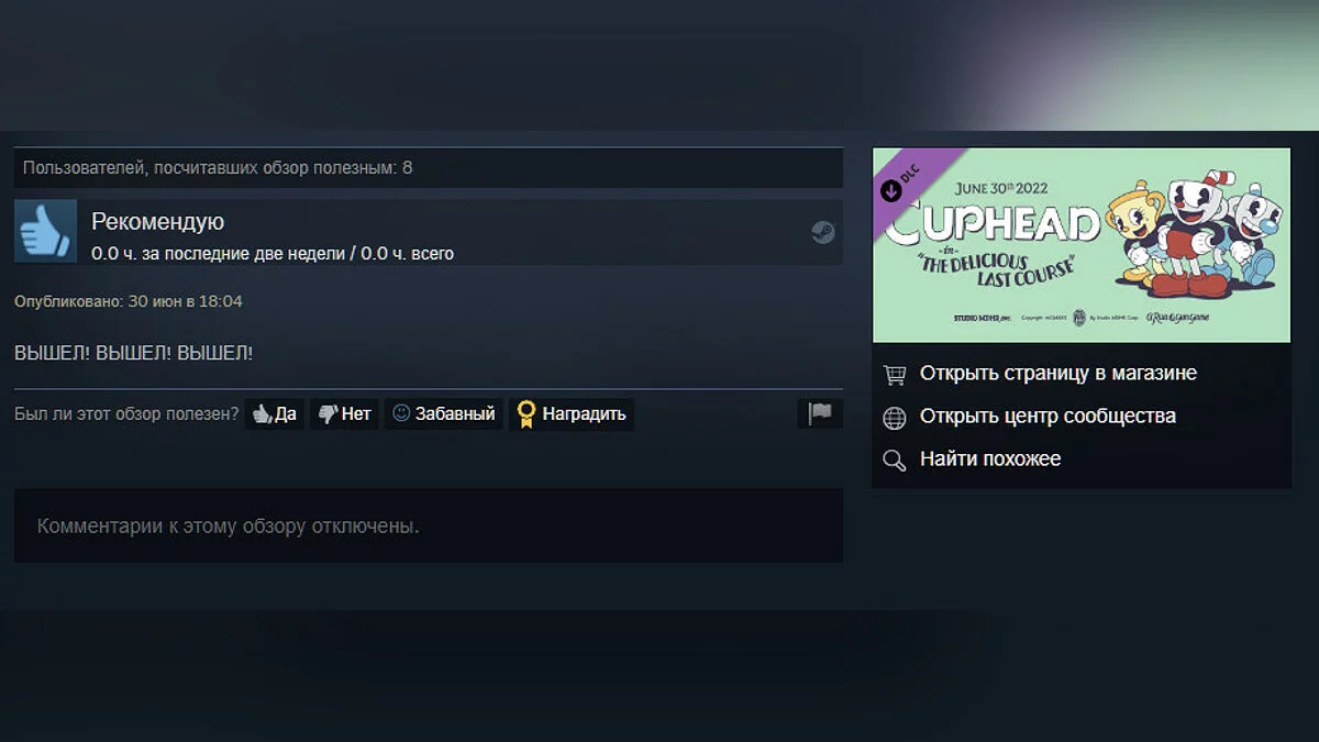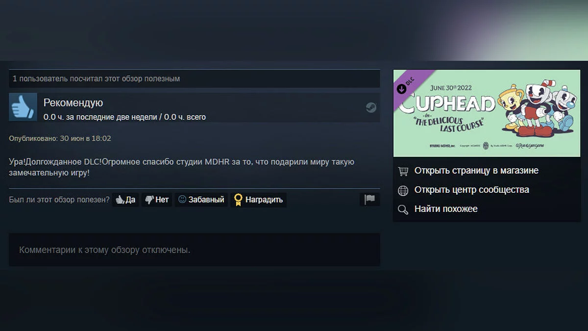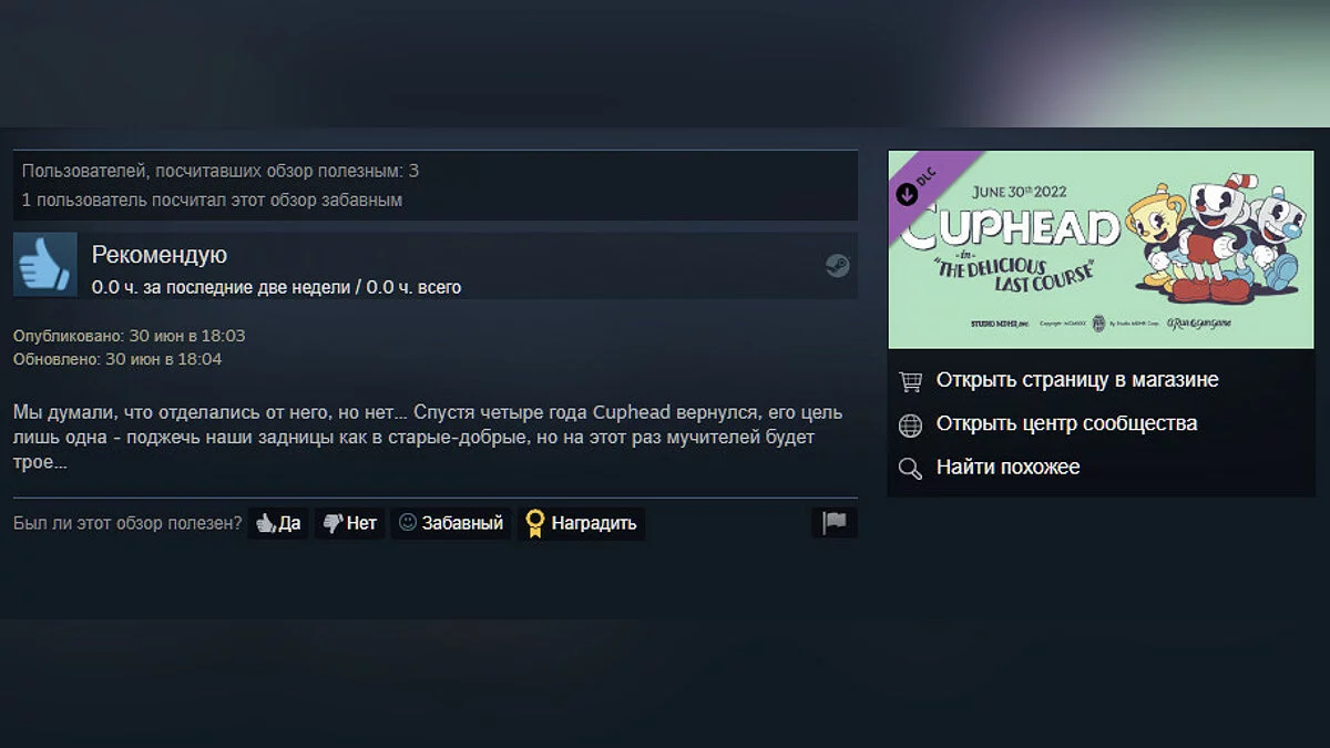 В последний день июня студия разработчики Cuphead выпустили первое крупное дополнение — The Delicious Last Course. Цена в Steam составляет всего 169 рублей.