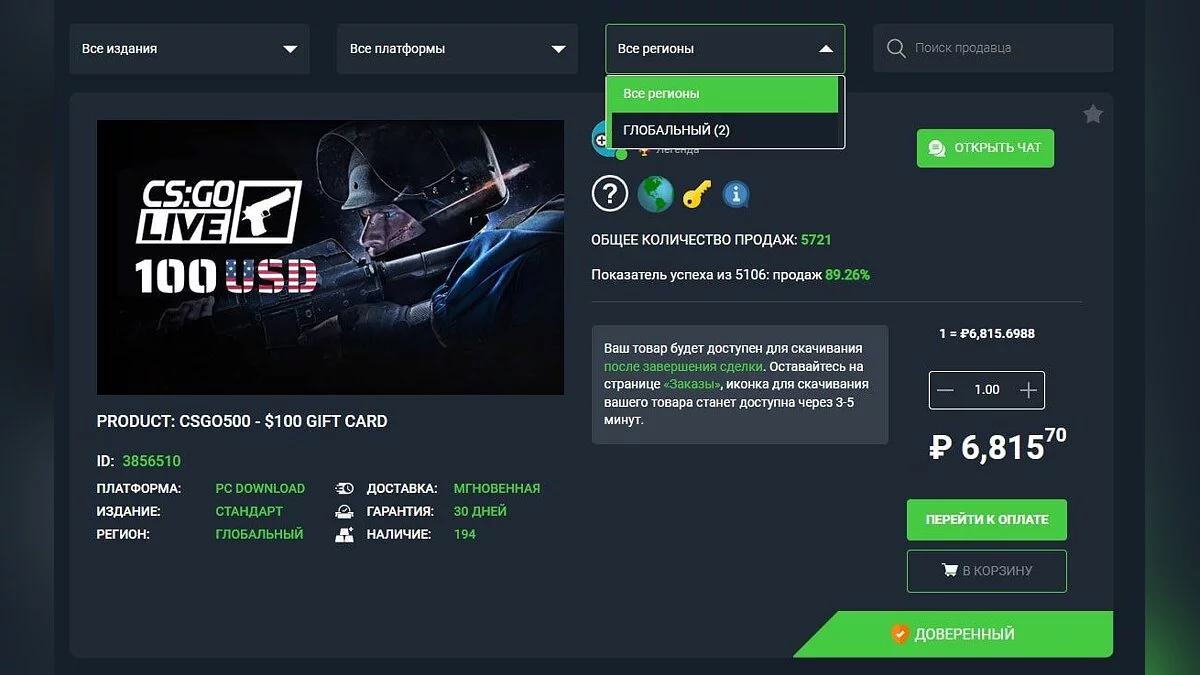 Внимание! Перед тем, как совершить покупку, необходимо выбрать регион, для которого нужна карта пополнения. Это можно сделать прямо на странице товара.