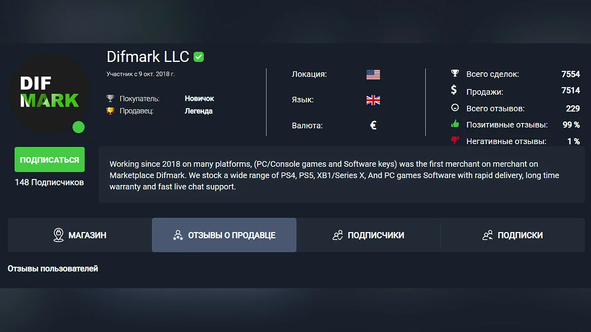 P2P-площадка Difmark предлагает геймерам крутые предложения на покупку карт пополнений различных подписочных сервисов и не только. Адекватные цены, гарантия и широкий ассортимент товаров прилагаются. Ну а еще мы дарим дополнительную скидку 10% всем желающим.