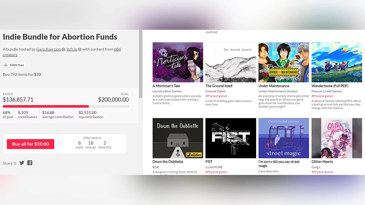 Средства с продажи этого бандла пойдут в Национальную сеть фондов абортов США (National Network of Abortion Funds). Стоит заметить, что по отдельности все игры стоят свыше $3000. В их число входят как цифровые тайтлы, так и настолки, выполненные в PDF-формате (их можно распечатать).