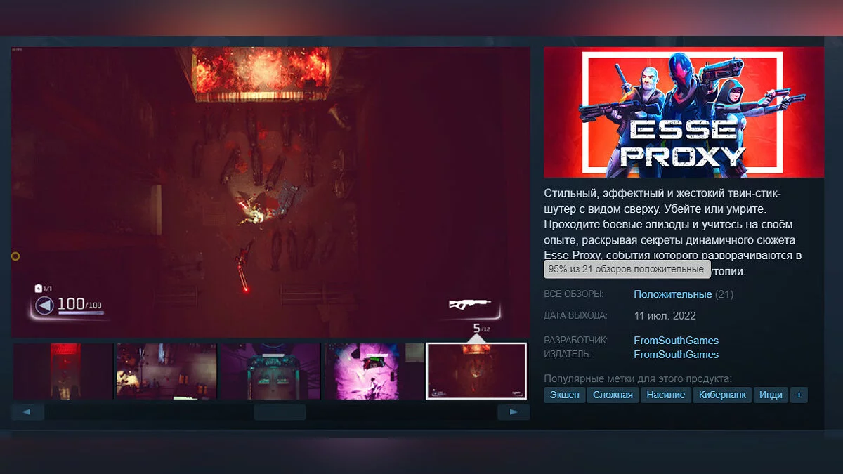 Независимая студия FromSouthGames выпустила в Steam киберпанковый твин-стик-шутер с видом сверху под названием Esse Proxy, который на момент написания новости имеет рейтинг 95%. Многие геймеры называют игру смесью Hotline Miami и Cyberpunk 2077.