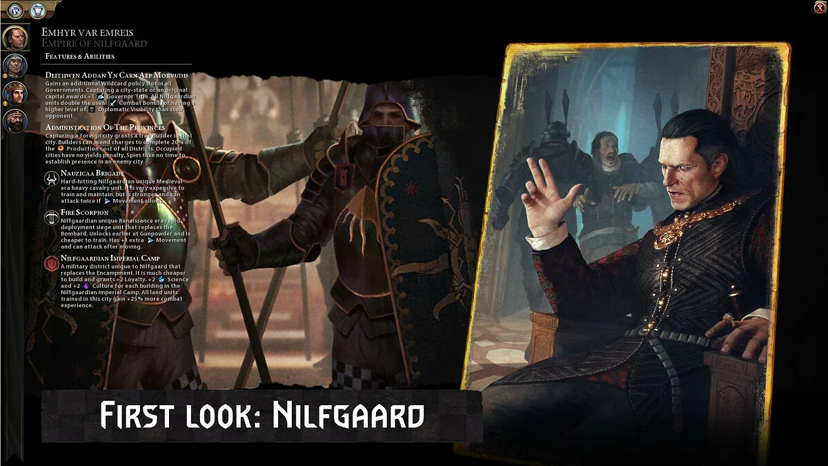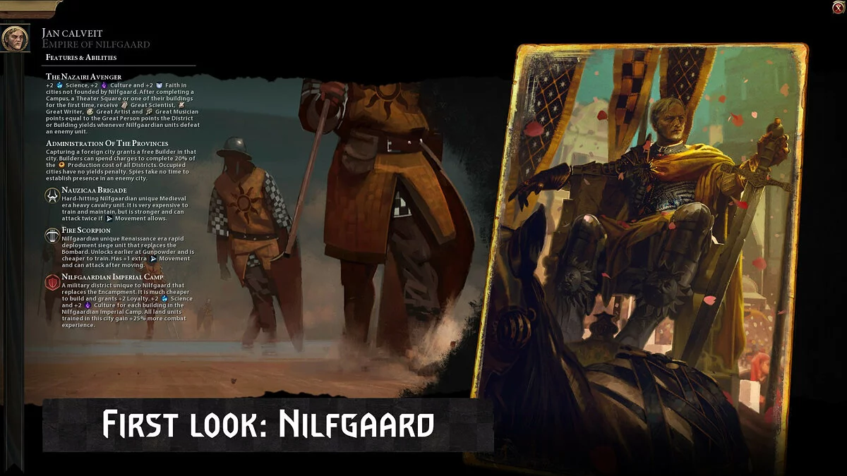 Моддер с ником iPlayGamesITA выпустил модификацию для Sid Meier's Civilization 6, которая добавляет в игру Нильфгаард из вселенной The Witcher и двух лидеров на выбор — Эмгыра вар Эмрейса (бонусы за захват столицы и повышение дипломатической видимости государства) и Йоанна Кальвейта (бонусы к науке, культуре и вере).