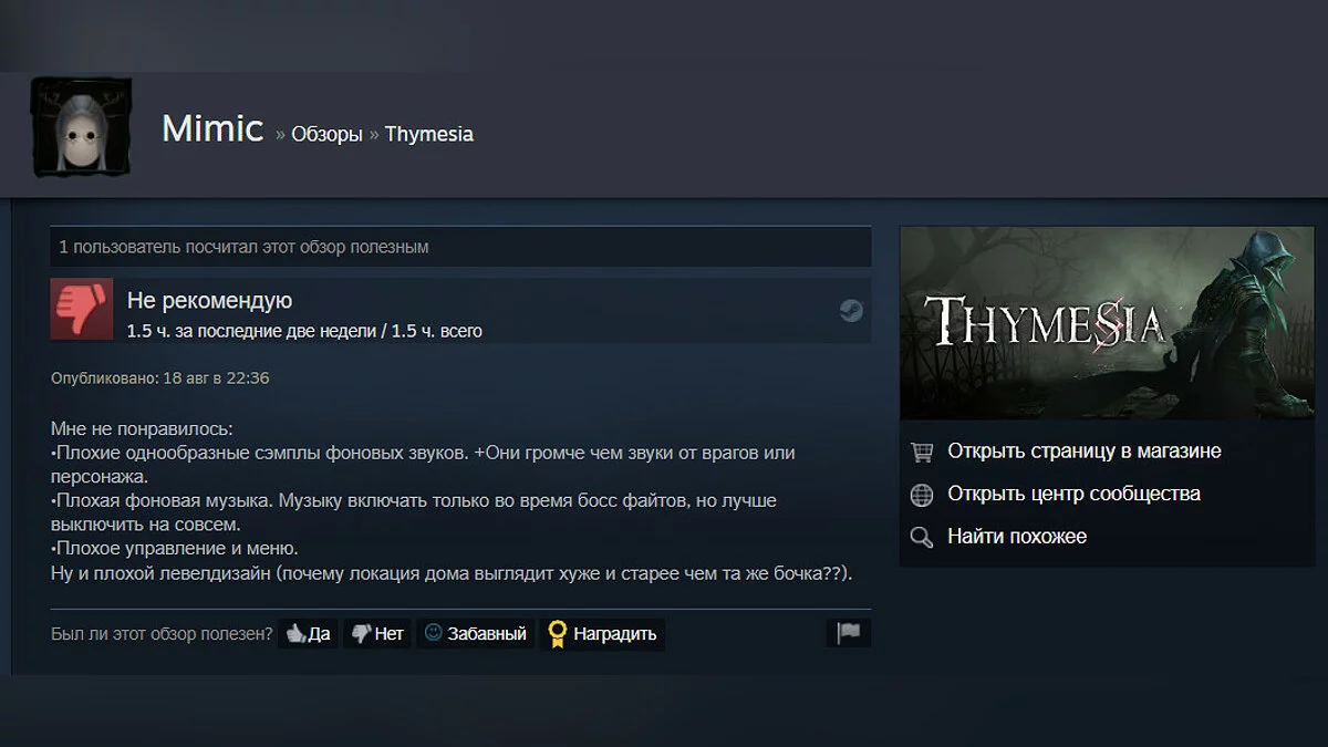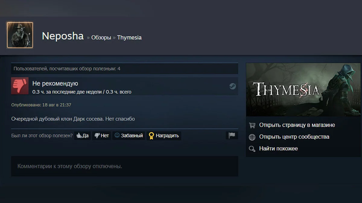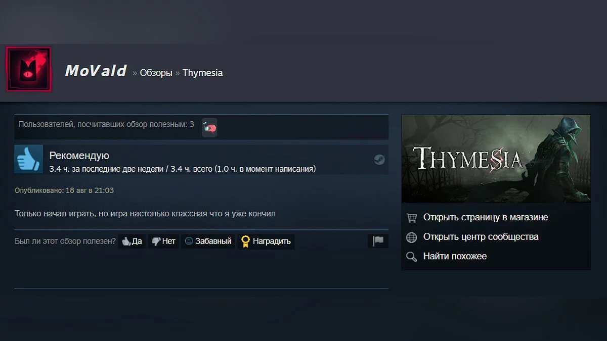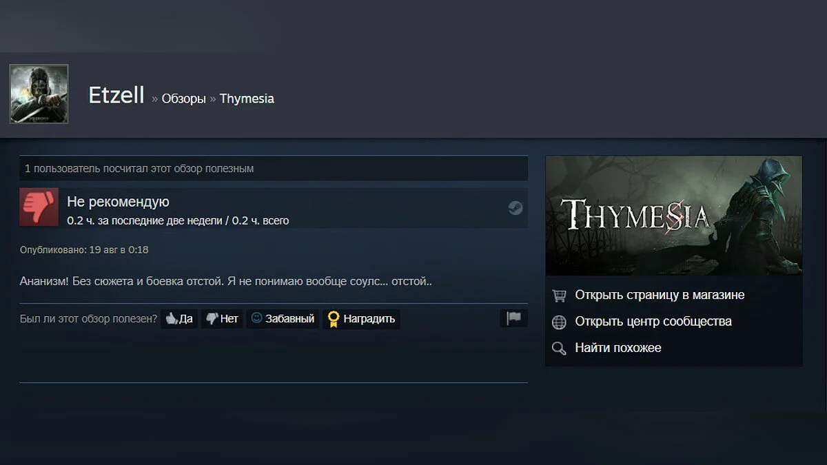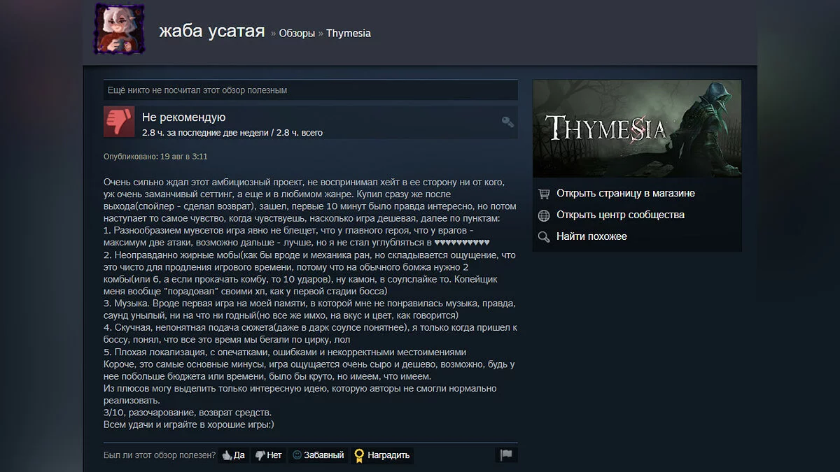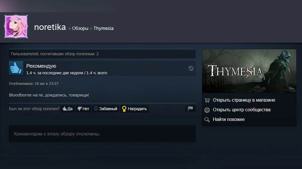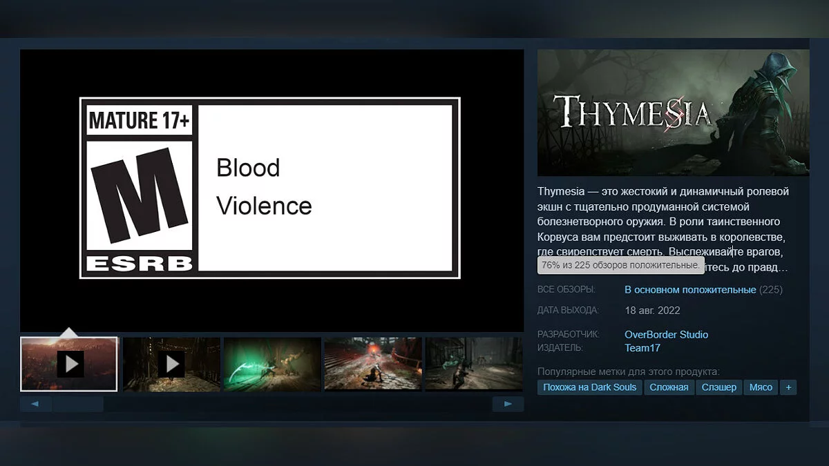 Вчера (18 августа) состоялся релиз соулслайк-экшена с элементами RPG под названием Thymesia. Менее чем за сутки игра получила свыше двух сотен отзывов. Мы собрали некоторые реакции геймеров в Steam. На момент написания новости рейтинг проекта составляет 76%.