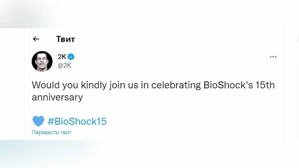 Первая игра BioShock вышла 15 лет назад, 21 августа 2007 года. И в издательстве 2K предложили отпраздновать это событие, разместив сообщение в Twitter. Аватар аккаунта сменили на лицо Эндрю Райана.