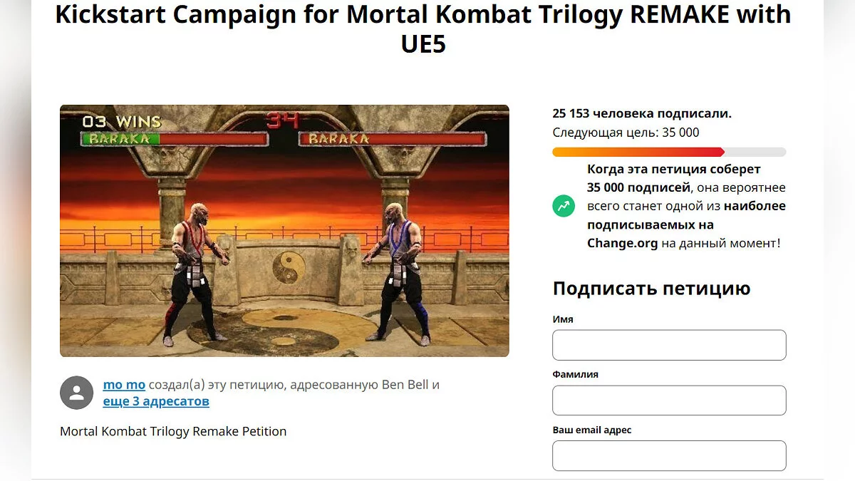 Авторы проект вновь напомнили всем небезразличным геймерам, которые хотели бы увидеть классические MK с обновленной графикой, подписать петицию на Change.org. На момент написания новости количество подписей уже превышает 25 тысяч.