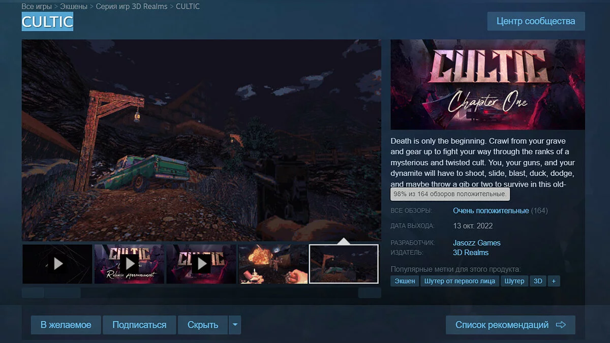 Компания 3D Realms и студия Jasozz Games выпустили в Steam первую главу олдскульного шутера в духе DOOM и Blood под названием CULTIC, который был анонсирован в прошлом году в рамках мероприятия Realms Deep 2021. Судя по первым отзывам, геймерам проект очень понравился.