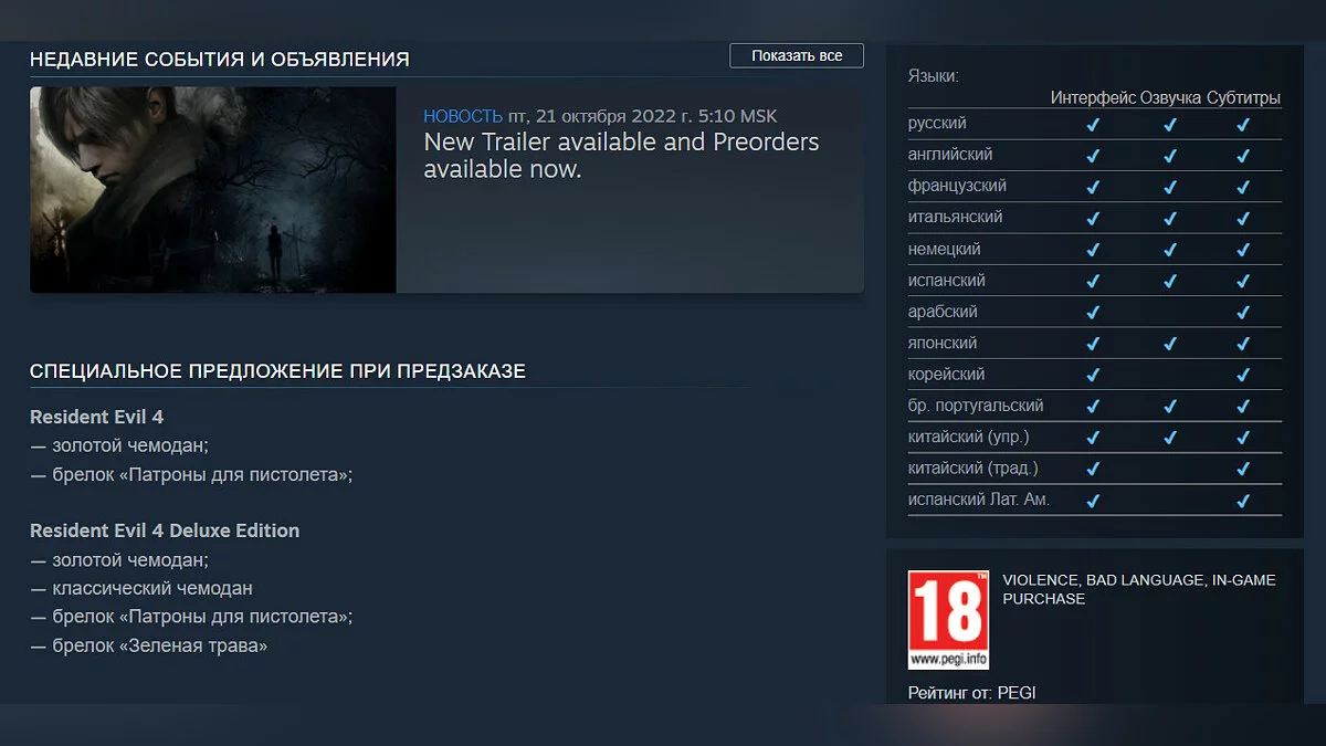 Игровые новости Новости Раскрыты официальные системные требования ремейка Resident Evil 4. В российском Steam игра недоступна