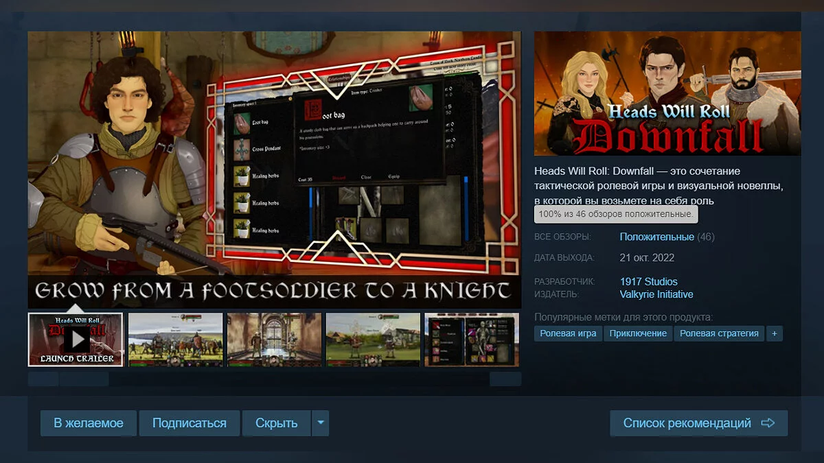 Вчера (20 октября) российские разработчики из студии 1917 Studios выпустили в Steam ролевую игру с элементами визуальной новеллы под названием Heads Will Roll: Downfall. Издателем выступает компания Valkyrie Initiative. На момент написания новости рейтинг проекта составляет 100%.