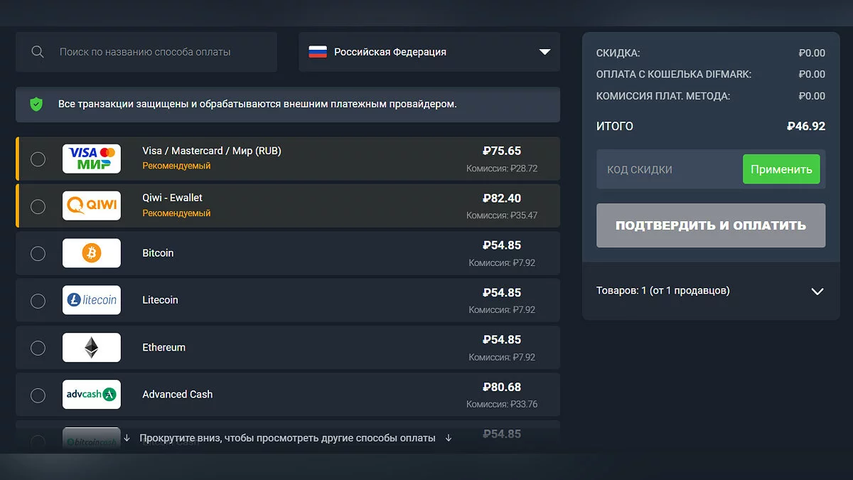 После добавления товара в корзину и перехода к оплате, необходимо выбрать валюту и платежную систему, через которую будет произведена транзакция. Есть рубли и возможность оплатить товар через кошелек QIWI.