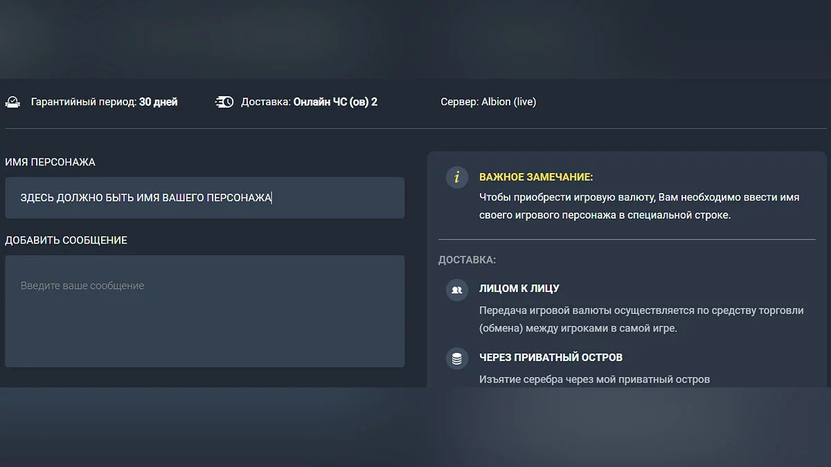 При покупке нужно обязательно выбрать сервер и количество валюты. Кроме того, может потребоваться ник персонажа, для которого она предназначается.