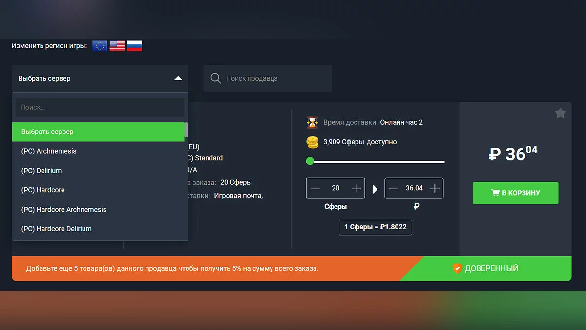 Ну а теперь о том, как правильно оформить заказ. Сначала нужно выбрать сервер игры (в списке есть разные варианты). Далее определиться с продавцом. На площадке будут показаны предложения с разными ценами. После этого необходимо указать количество покупаемой валюты.