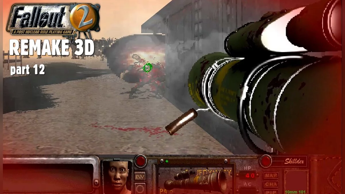В Fallout 2 Remake игрок может создать своего персонажа и опробовать в бою с врагами или невраждебными персонажами разные виды оружия, включая пистолет-пулемет, нож, гатлинг-лазер и импульсную винтовку.