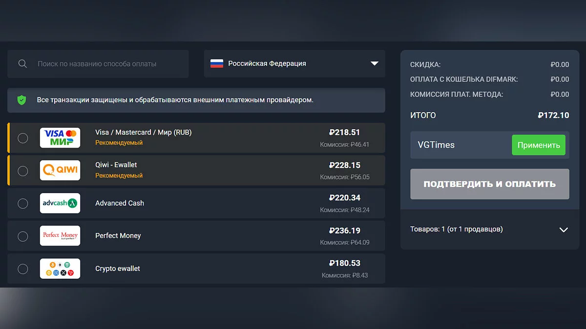 На странице оформления заказа требуется выбрать платежную систему (доступен кошелек QIWI и не только), а также активировать промокод VGTimes. После активации автоматически применяется скидка 10% на все товары в корзине.