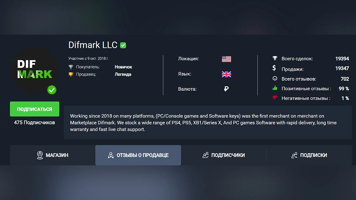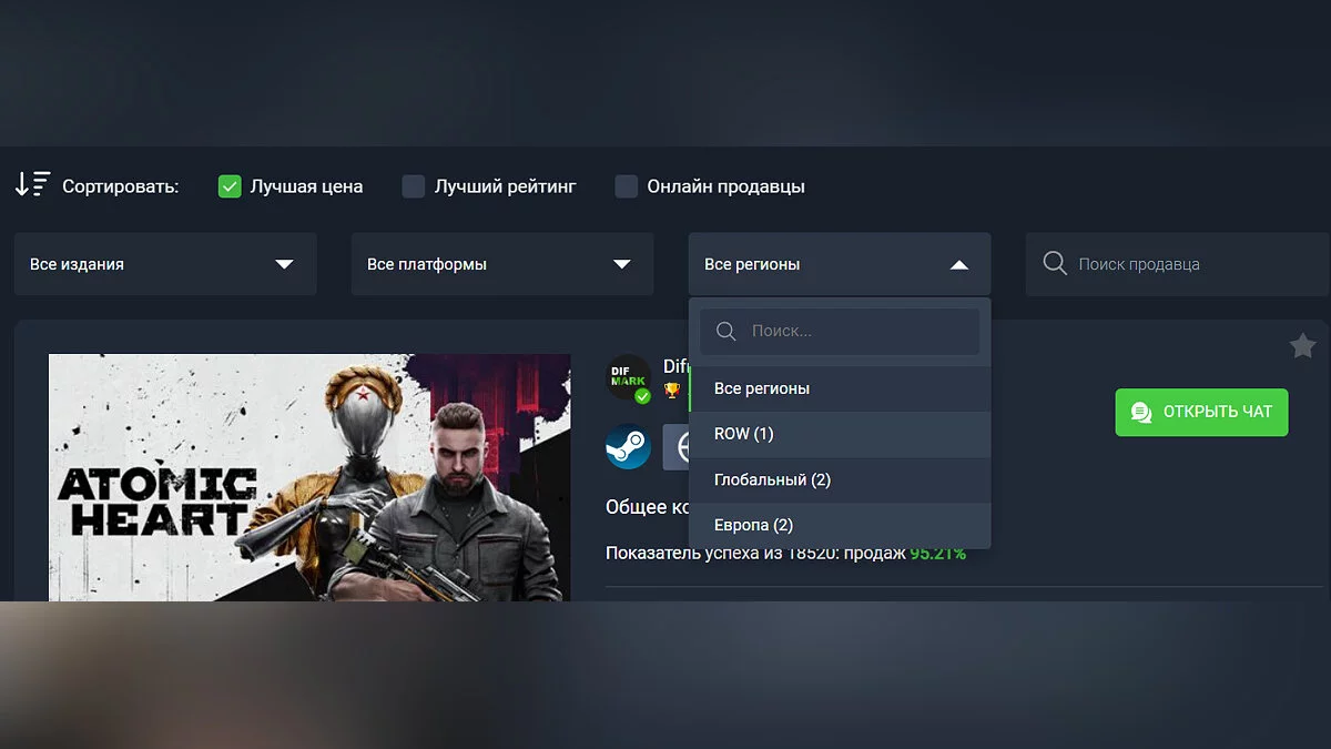 Для покупки товара сначала необходимо выбрать платформу и продавца. Предварительно можно ознакомиться с отзывами.