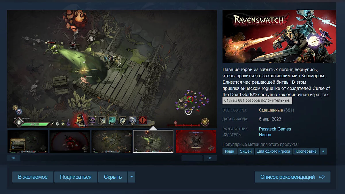 Купить Ravenswatch в Steam можно за 639 руб с учетом скидки 10% (действует до 13 апреля). Полноценный релиз состоится в 2024 году как на PC, так и на консолях (PS4, PS5, Xbox One, Xbox Series X/S и Nintendo Switch).