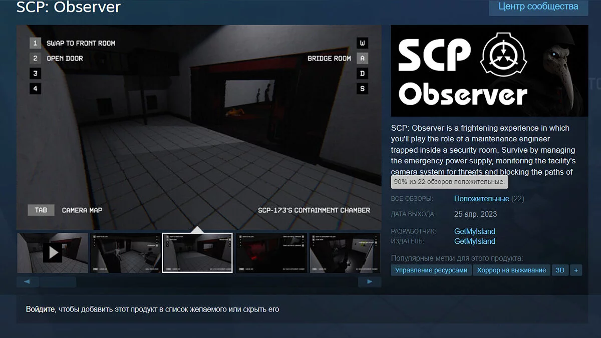 Студия GetMyIsland выпустила в Steam необычную игру под названием SCP: Observer, геймплей которой выполнен в стиле Five Nights at Freddy's. Проект получил положительные отзывы от геймеров (рейтинг 90% на момент написания новости).