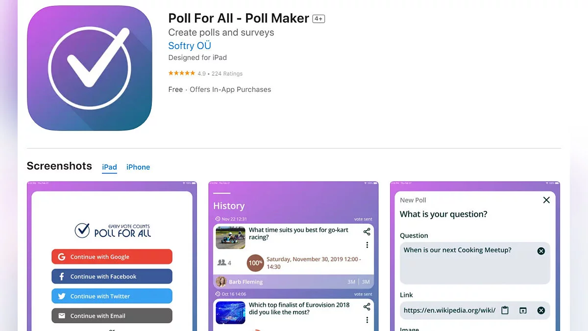 - Poll For All — Poll Maker — программа, позволяющая создавать опросы и делиться ими с друзьями (загрузить бесплатно);