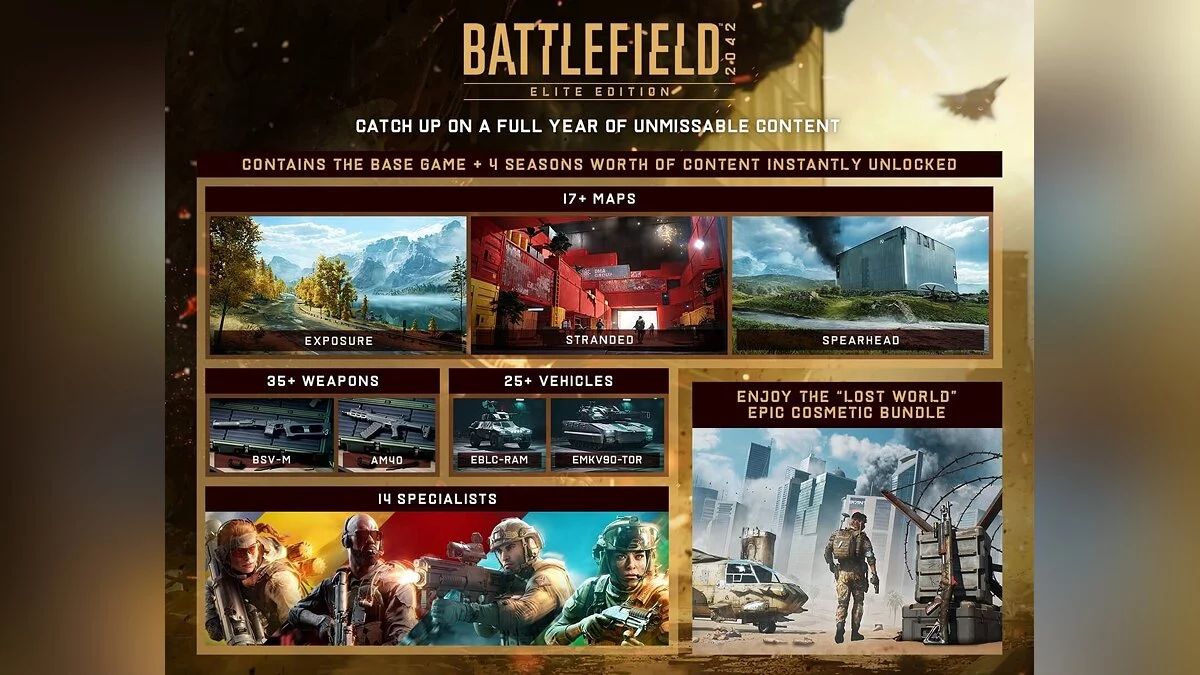 Кроме этого, EA выпустила Battlefield 2042 Elite Edition — ещё одно издание, которое включает в себя весь контент шутера за первые четыре сезона и уникальные наборы косметических предметов. Всё это по цене в 90 долларов (~7 200 ₽), но если у вас есть копия игры, новое издание обойдется в 30 долларов (~2 400 ₽).