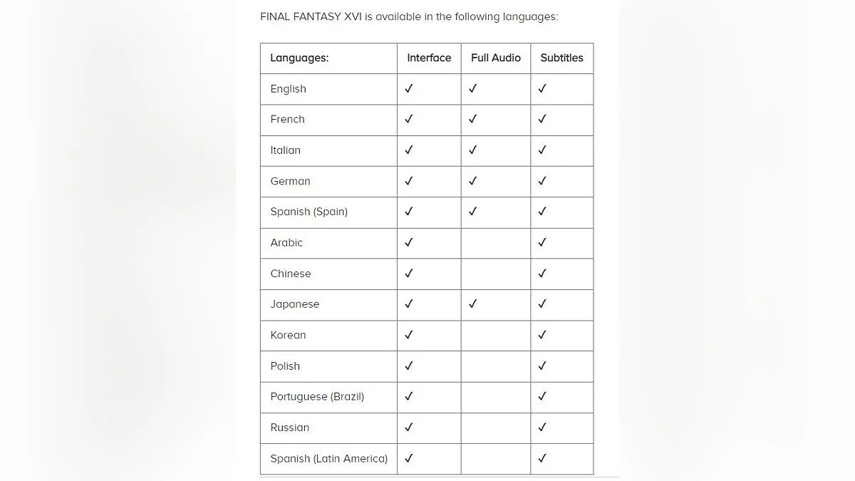 На своем официальном сайте компания Square Enix опубликовала список всех локализаций, которые будут доступны в предстоящей Final Fantasy XVI. Среди них есть и русский язык, но перевод касается только интерфейса и субтитров.