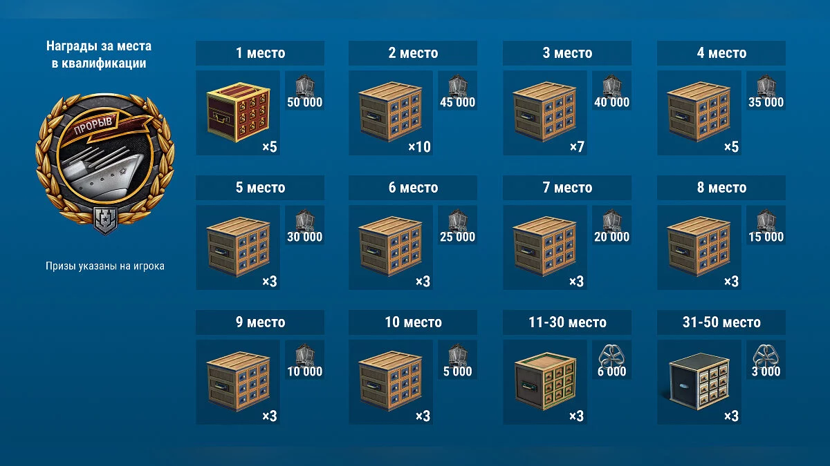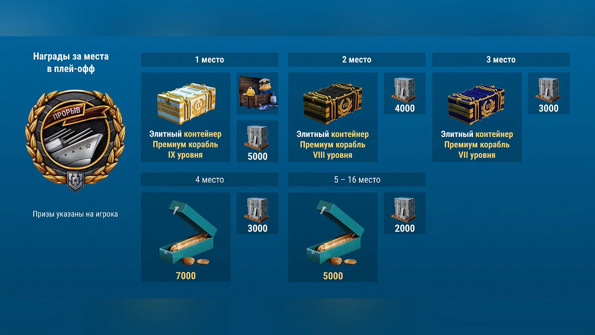Среди наград выделяют элитные контейнеры с премиум кораблями, сталь, дублоны, сувенирный набор с медалями и не только. Кроме того, всем игрокам, которые пройдут регистрацию и попадут в итоговую таблицу Квалификации, гарантированно подарят один контейнер «Редкие бонусы» и два контейнера «Больше угля».