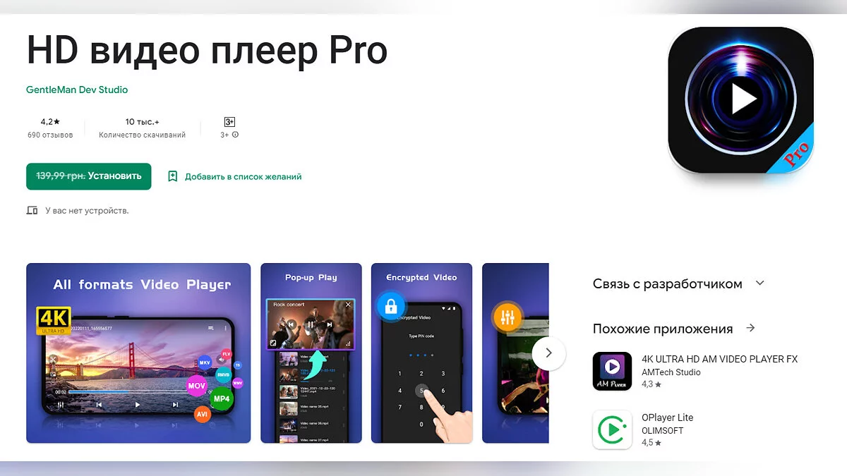 - HD Video Player Pro — удобный видеоплеер с поддержкой многих форматов и разрешения 4K (загрузить бесплатно);