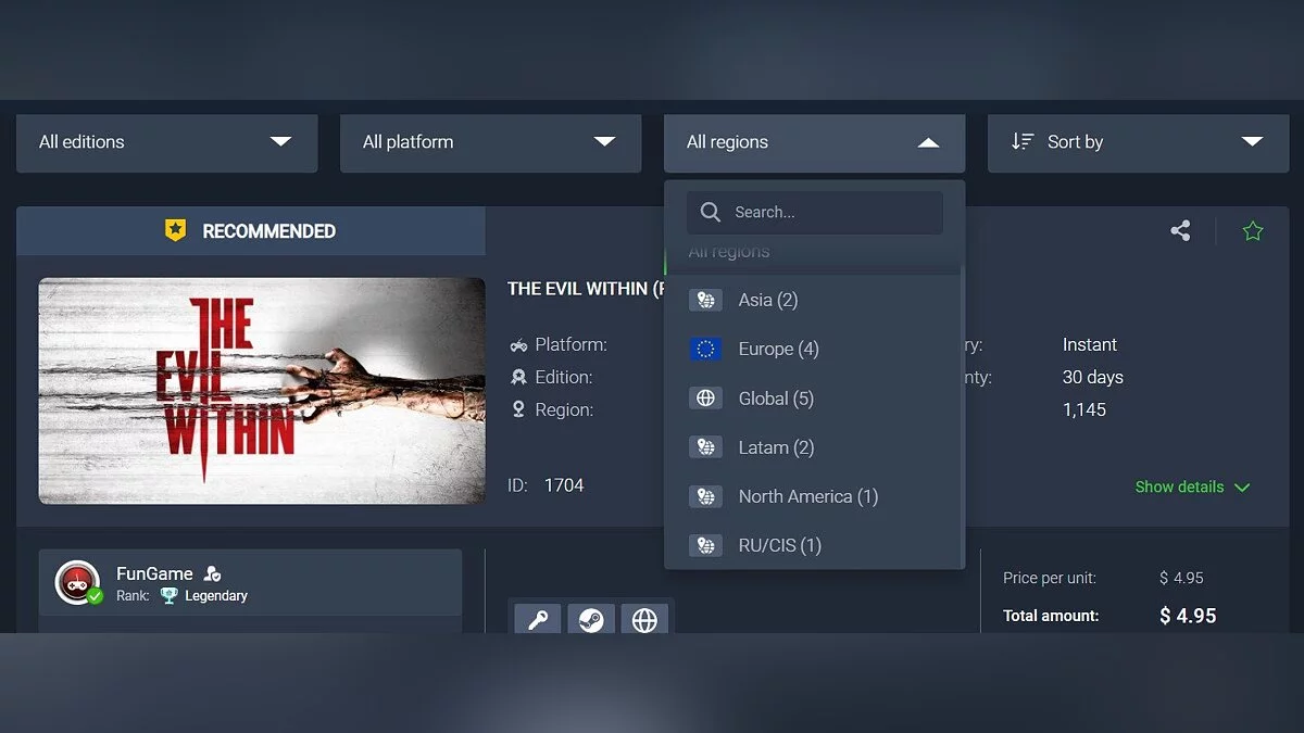 Чтобы купить игру, сначала нужно выбрать тип издания, платформу и регион (для РФ подходит Global или RU/CIS). Далее нужно найти продавца. Цены на один и тот же проект у каждого из них могут отличаться.