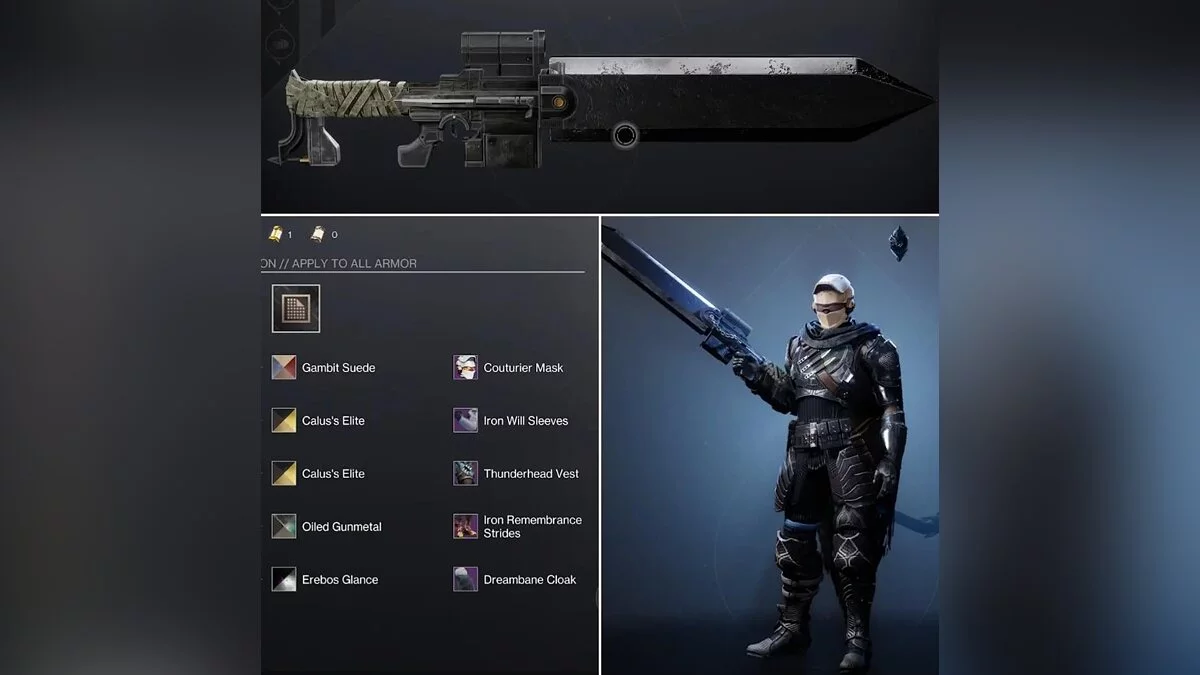 На втором скрине можно увидеть предметы, которые использовались для того, чтобы охотник в игре выглядел как Гатс. В качестве основного оружия, имитирующего двуручный меч «Убийца Драконов», выступает снайперская винтовка «Бремя Идзанаги» с орнаментом Worldshaper.