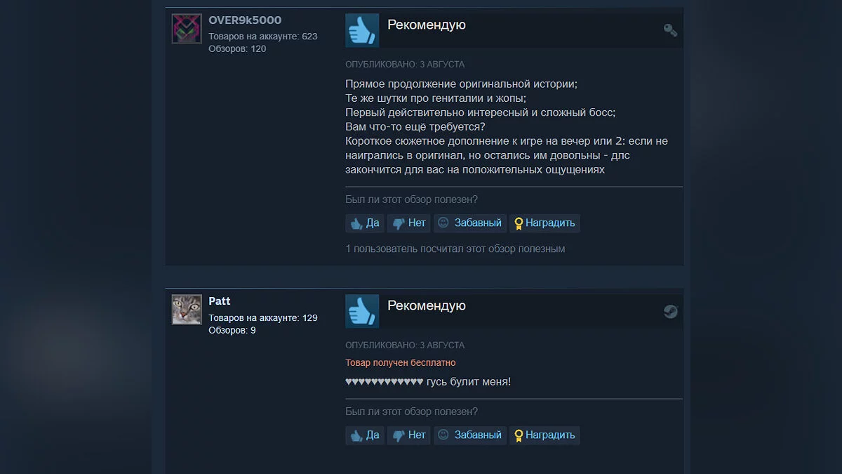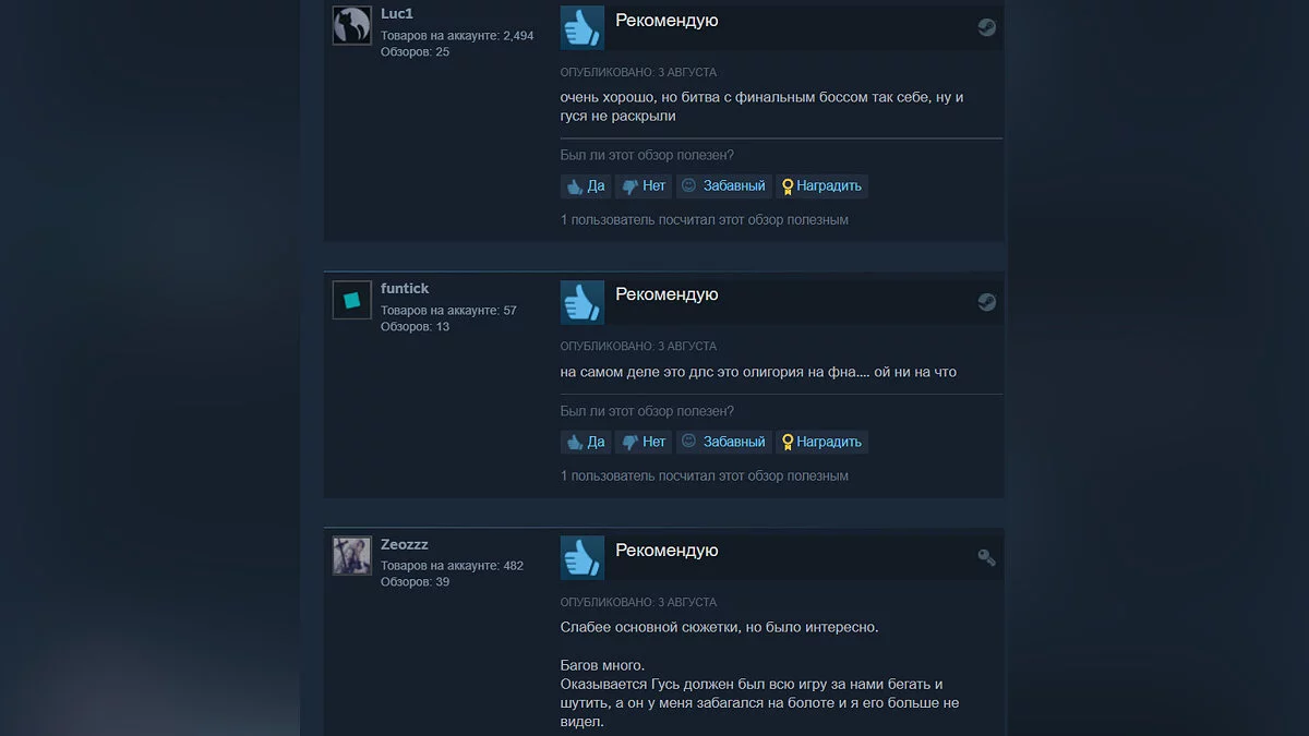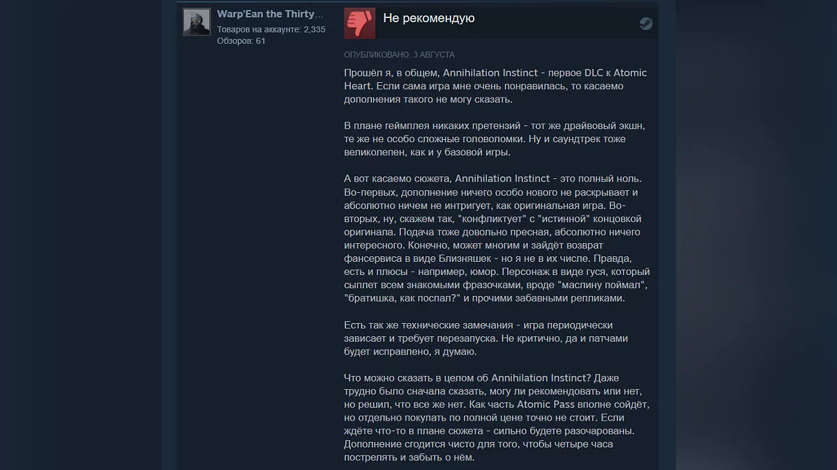 Вчера (2 августа) состоялся релиз первого сюжетного дополнения для Atomic Heart — «Инстинкт истребления» (Annihilation Instinct). В Steam оно получило очень положительные отзывы от геймеров. Многим крайне понравился говорящий гусь, которому к слову на сайте посвящена отдельная статья.