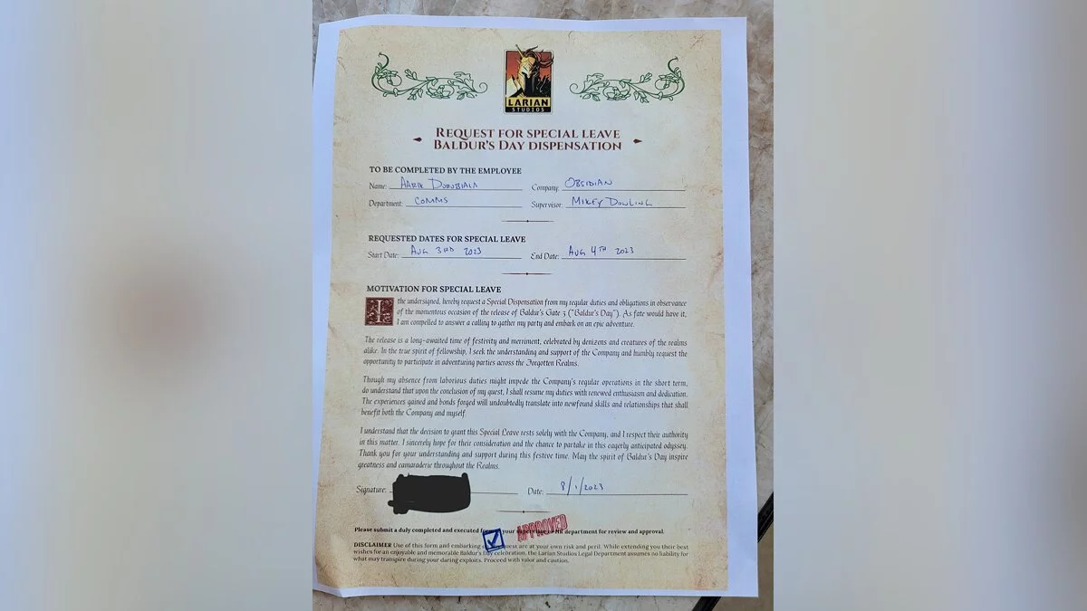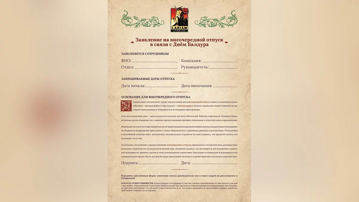 Baldur's Gate 3 потребует десятки часов на прохождение, поэтому самые большие фанаты D&D уже берут отпуска. В честь скорого выхода студия Larian составила специальный бланк с заявлением для вашего руководителя.