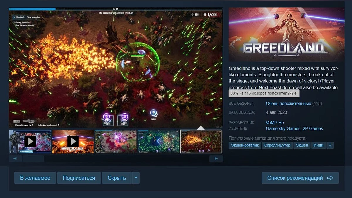 В раннем доступе Steam вышел новый шутер с видом сверху и элементами выживания под названием Greedland. По словам разработчиков, он понравится фанатам Vampire Survivors, Crimsonland и Alien Shooter. Проект получил очень положительные отзывы — рейтинг 80% на момент написания новости.