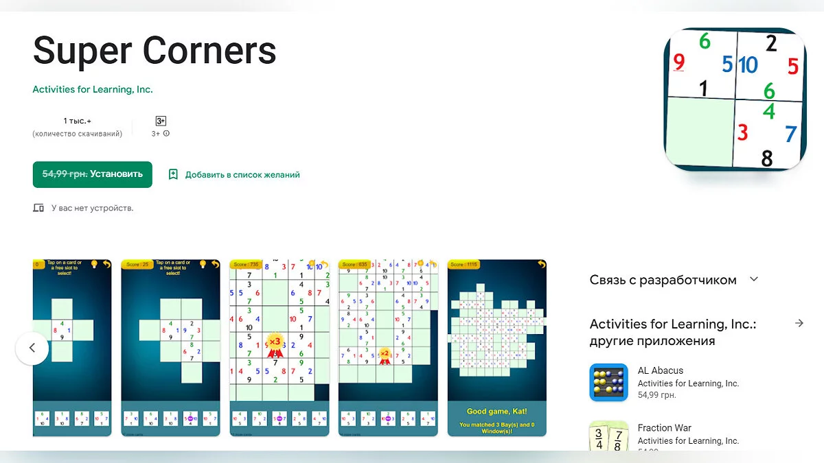 - Super Corners — головоломка, в которой игрок должен взаимодействовать с цифрами для получения числа пять (загрузить бесплатно).