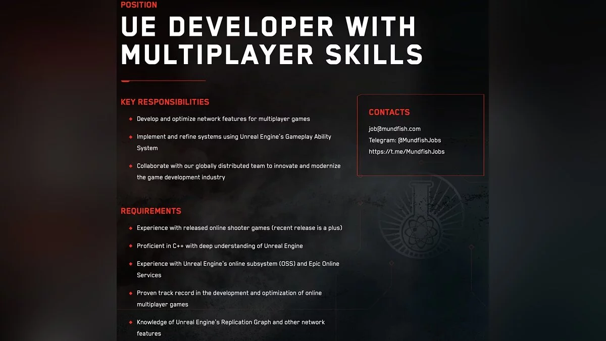 На сайте Mundfish появилась новая вакансия. Студия ищет Unreal Engine-разработчика с опытом работы над мультиплеером. Возможно, этот режим могут добавить в сиквел Atomic Heart, который уже был подтвержден главой Mundfish, Робертом Багратуни.