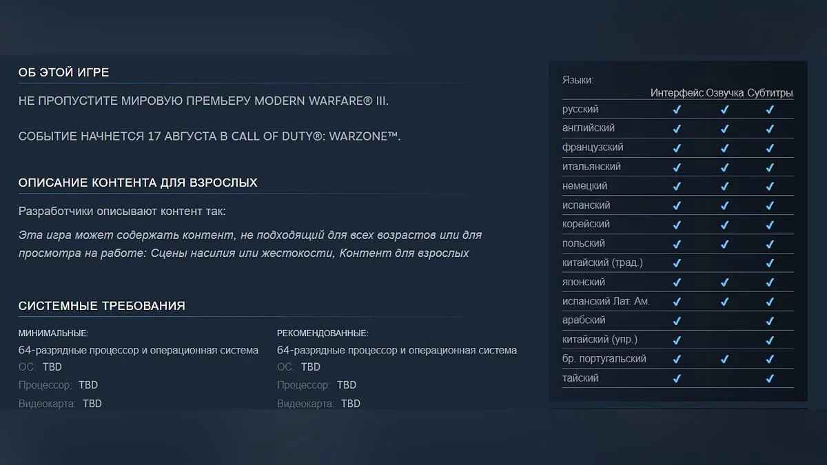 В Steam уже появилась страничка Call of Duty: Modern Warfare 3 — стало известно, на какие языки переведут игру