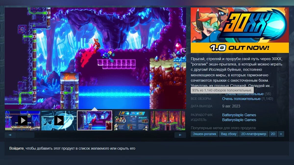 Вчера (9 августа) в Steam состоялся релиз полной версии экшен-платформера с элементами рогалика под названием 30XX. Ранее игра была доступна в раннем доступе. Ее рейтинг на момент написания новости составляет 93%.