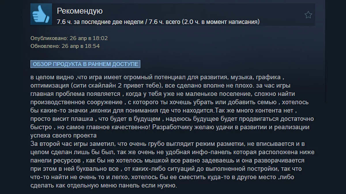 Игру менее чем за сутки оценили более 7 000 пользователей. Большинство отмечает хорошую оптимизацию (при том, что проект делал один человек), медитативный геймплей, продуманную экономику и приятную графику. В «минусы» игры записали довольно небольшую продолжительность, малое количество контента и недоработанные механики.