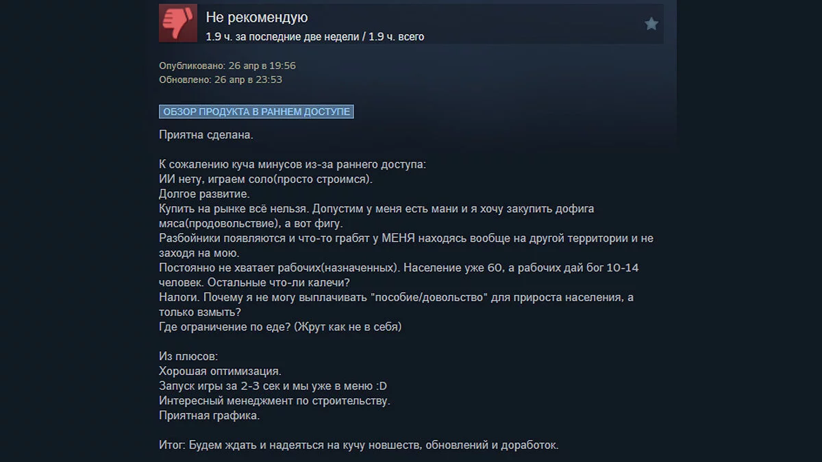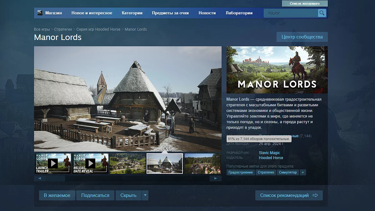 Средневековый градостроительный симулятор Manor Lords, который ранее добавило в желаемое два миллиона игроков, хорошо показал себя в первый день релиза. Несмотря на ранний доступ, рейтинг игры в Steam составляет уже 91%.