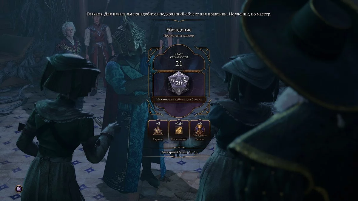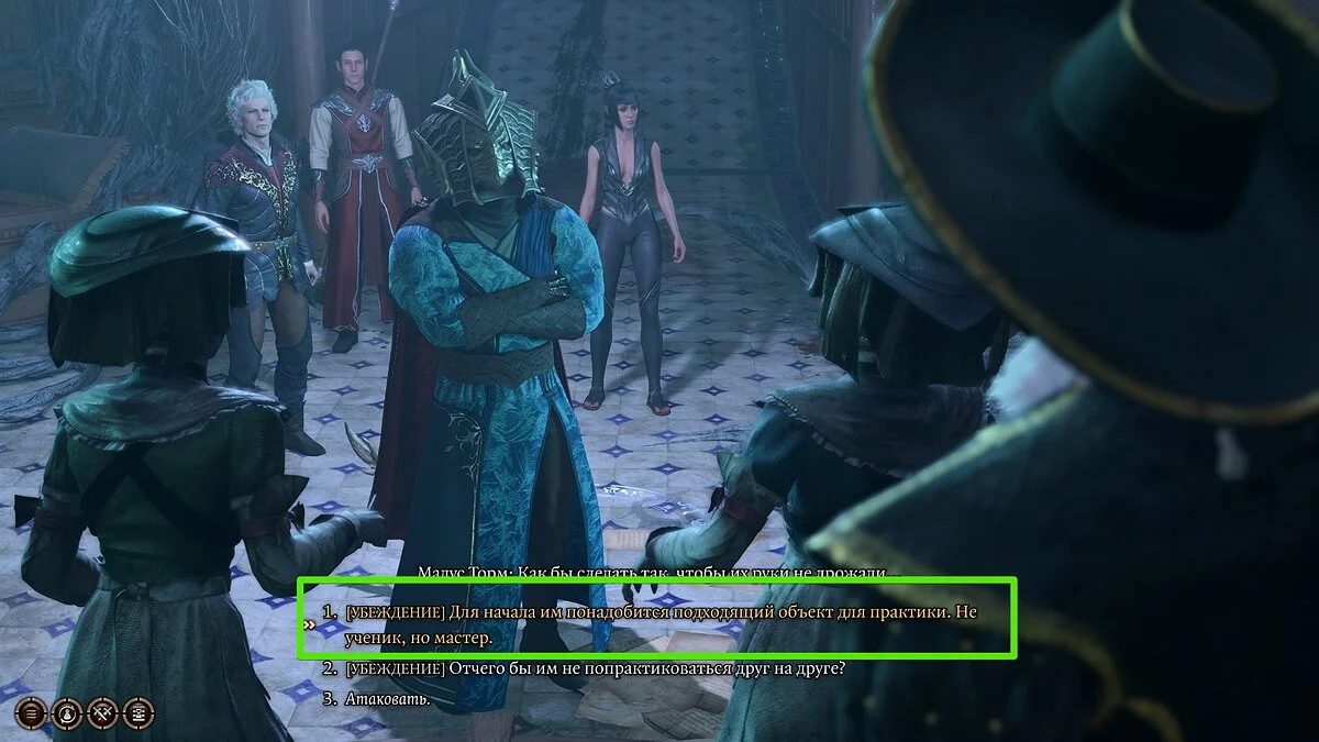Бегите вперёд по коридору и откройте двойную дверь, после чего спуститесь в амфитеатр. Начнётся катсцена с Малусом Тормом и его медсёстрами, во время которой вы можете осмотреть инструменты сестёр и отказаться от «лечения». После чего, если пройдёте проверку Убеждения, можете заставить сестёр попрактиковаться на докторе. Для этого выберите «Для начала им понадобится подходящий объект для практики. Не ученик, но мастер». Предупредим, что для прохождения понадобится 21 очко. Если у вас есть соответствующее умение, это очень поможет.