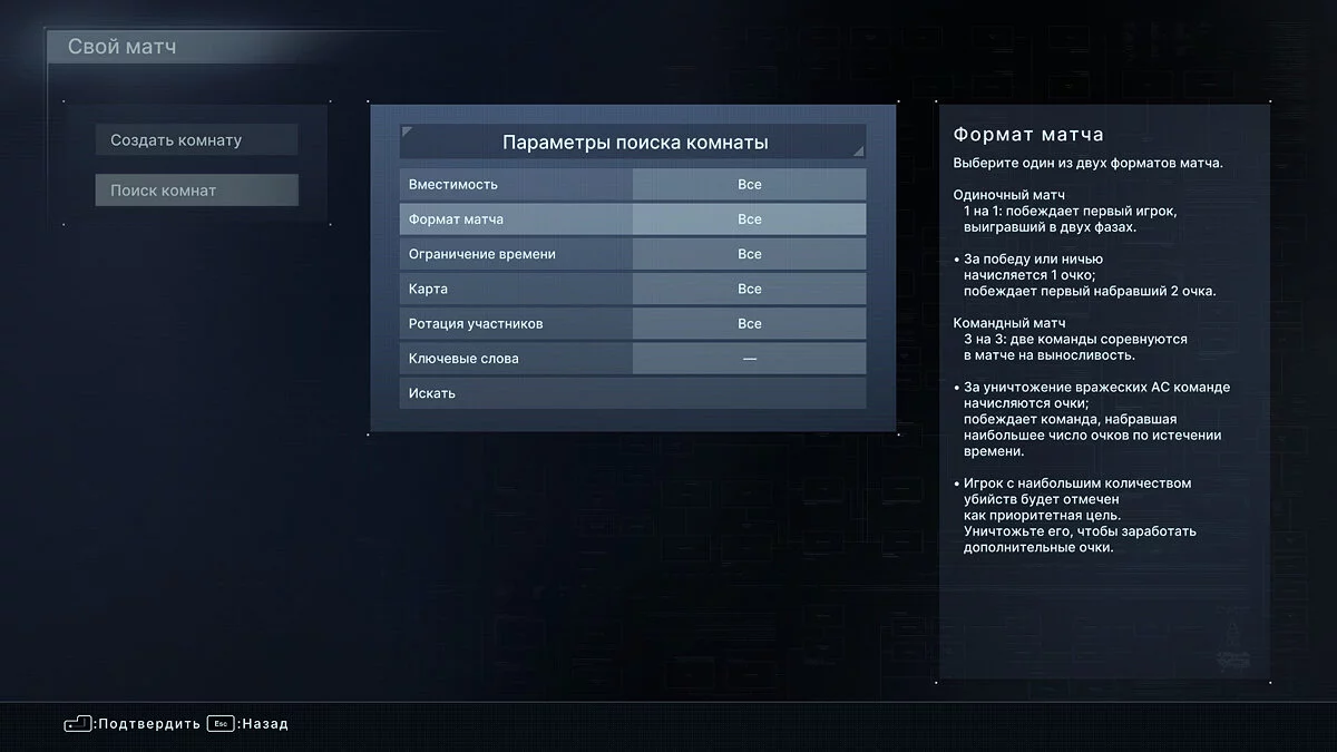После завершения миссии игрокам откроется последняя вкладка меню, позволяющая сразиться с другими игроками и испробовать различные сборки мехов. Здесь доступны режимы «1 на 1» и «3 на 3». Правила матчей отмечены на скриншоте ниже.