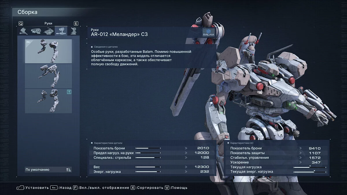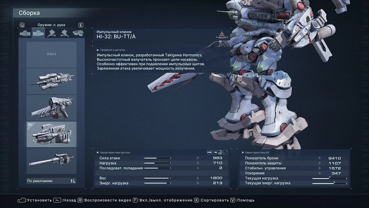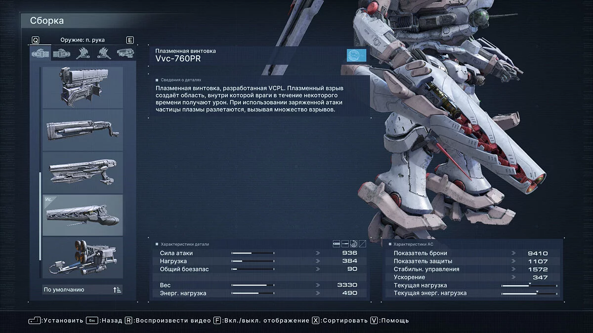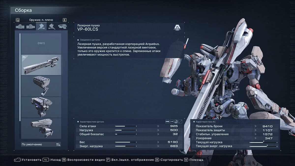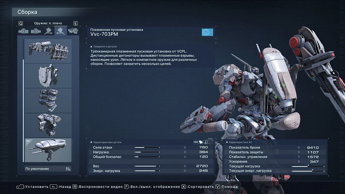 Что касается оптимальных билдов для прохождения арены, здесь все индивидуально и зависит от ваших навыков. Мы проходили большинство миссий Арены с помощью плазменной винтовки Vvc-760PR, импульсного клинка HI-32: BU-TT/A, лазерной пушки VP-60LCS в правом плече и плазменной пусковой установки Vvc-703PM в левом. Полная сборка указана на скриншоте ниже.
