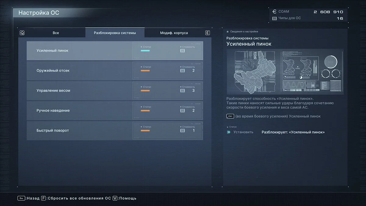 Кроме того, за победу на Арене игрок получает чипы — валюту, которую можно тратить на прокачку меха (настройку ОС). Они дают различные бонусы, которые даже при полной пересборке меха остаются у игрока. Условно делятся на четыре категории: