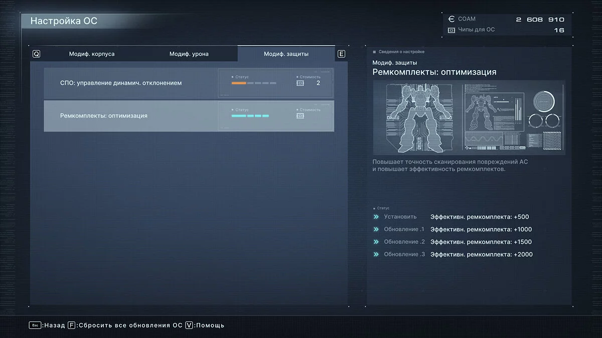 Модификации защиты — возможно, первое, куда вы вложите чипы. Только здесь можно повысить общую выживаемость меха, повысив количество здоровья, получаемого от ремкомплектов. Количество ремкомплектов при этом увеличить не получится. Здесь же есть улучшение, которое немного снижает в процентах любой получаемый урон.