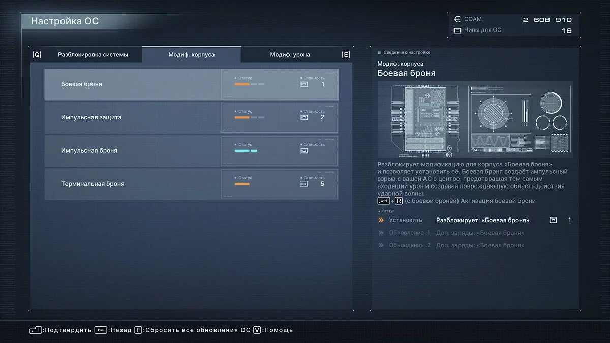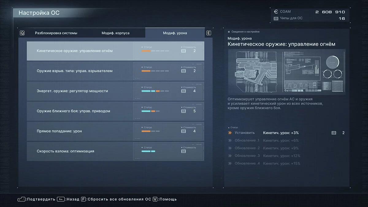 Помимо брони, игрок вправе вложить чипы в модификации урона и защиты. Модификации урона позволяют на проценты поднять урон каждого типа оружия: энергетического, кинетического и взрывного, а также урон оружия ближнего боя и «прямой» урон по оглушенным от сбитого «желтого» щита противникам. Здесь же можно прокачать и скорость взлома: подключение к дронам, вышкам и другим анимациям «загрузки данных».