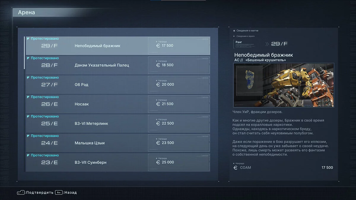 Сначала игроку на Арене будут доступны противники ранга «Е». Для того чтобы «подняться» выше и открыть новых врагов, необходимо выполнять сюжетные вылазки. После определенных миссий «Арена» будет пополняться и игрок сможет заработать больше чипов, чтобы прокачать своего меха.