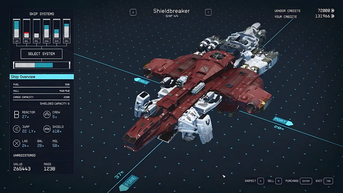 Чтобы улучшить свой корабль в Starfield, вы должны взаимодействовать с техником по обслуживанию кораблей и выбрать пункт «Я бы хотел посмотреть и изменить свои корабли» (I'd like to view and modify my ships). Вы перейдете в режим апгрейда, где можно модернизировать свой корабль. Обратите внимание, что некоторые улучшения имеют определённые требования к навыкам или уровню. Вы можете сделать несколько апгрейдов одновременно, а стоимость каждого последующего обновления будет суммироваться.