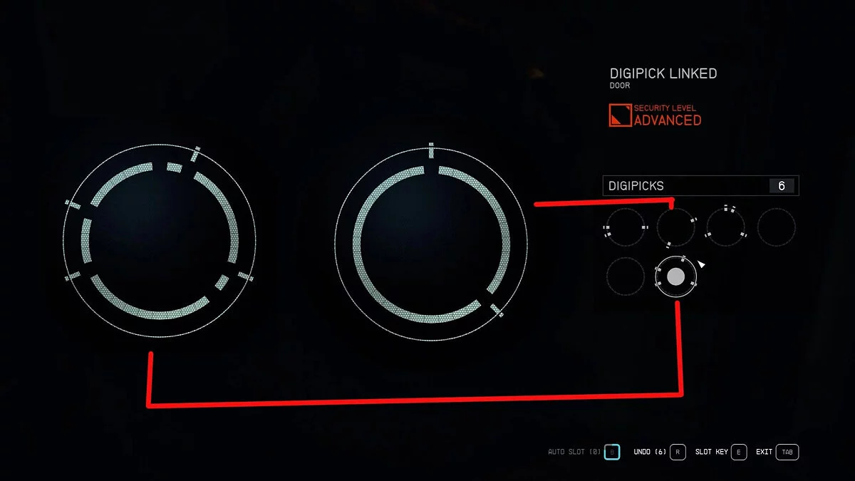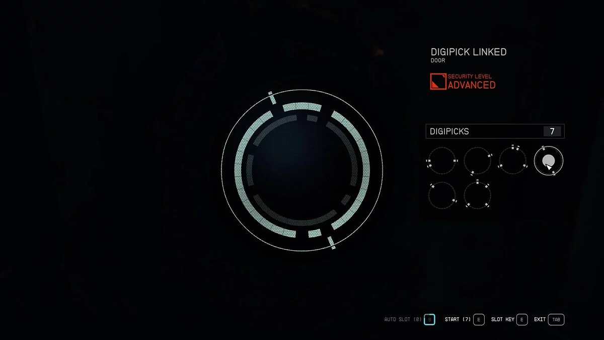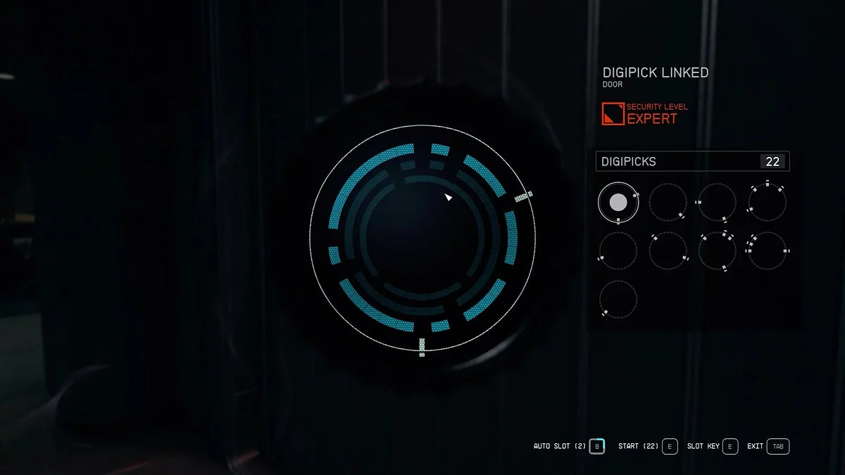 На втором уровне навыка «Безопасность» кольцо замка станет синим, когда ключ, который вы используете, поместится в него. Однако это не значит, что вы должны его использовать. Тот факт, что ключ подходит, не означает, что он является частью решения. Но это полезный совет, который упрощает механику взлома замков, особенно при использовании автоматического слота. Используйте это, чтобы быстро определить, какие шаблоны не потребуются или могут подойти только для центральных замков.