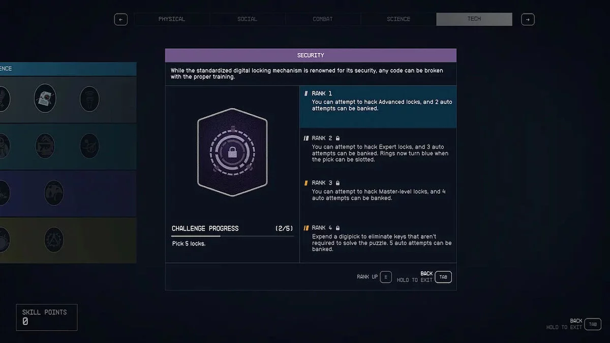 На первом уровне дерева технических навыков вы найдете навык под названием «Безопасность» (Security). Каждый уровень навыка позволяет вам справляться с более сложными замками: «Новичок» (без рангов), «Продвинутый» (ранг 1), «Эксперт» (ранг 2) и «Мастер» (ранг 3).