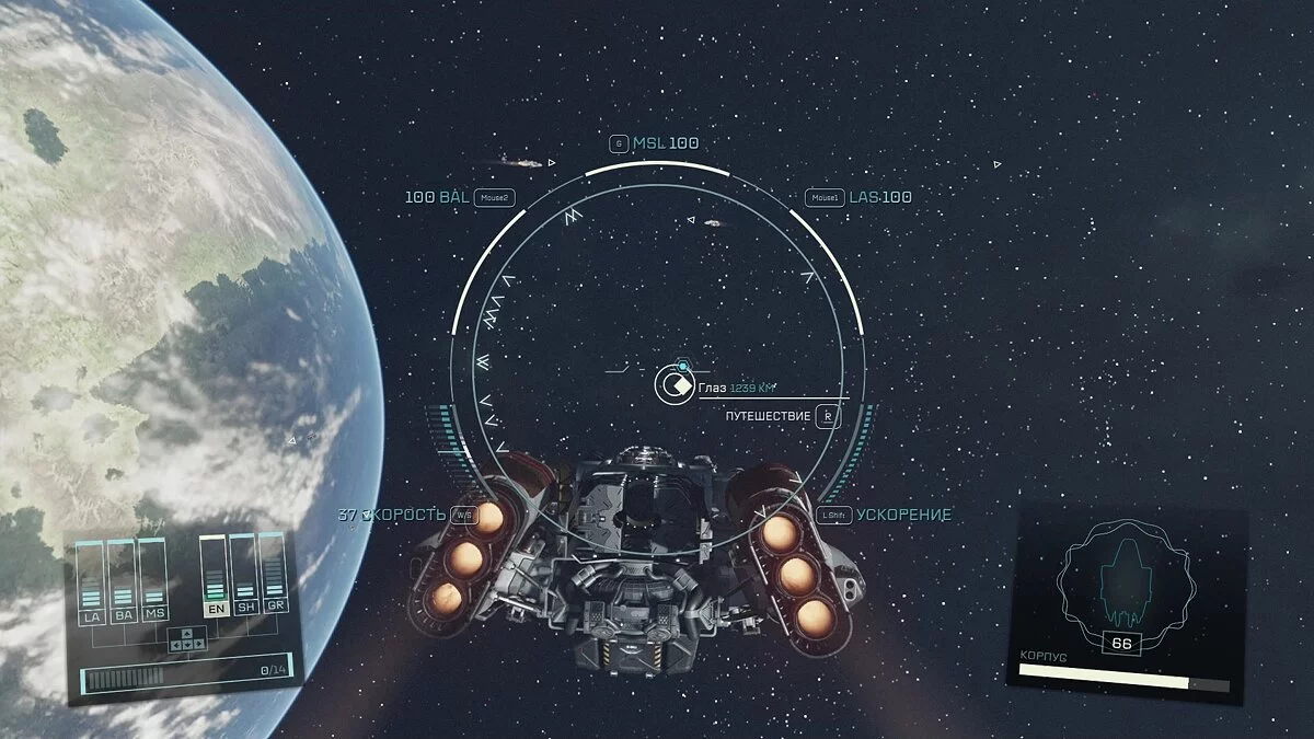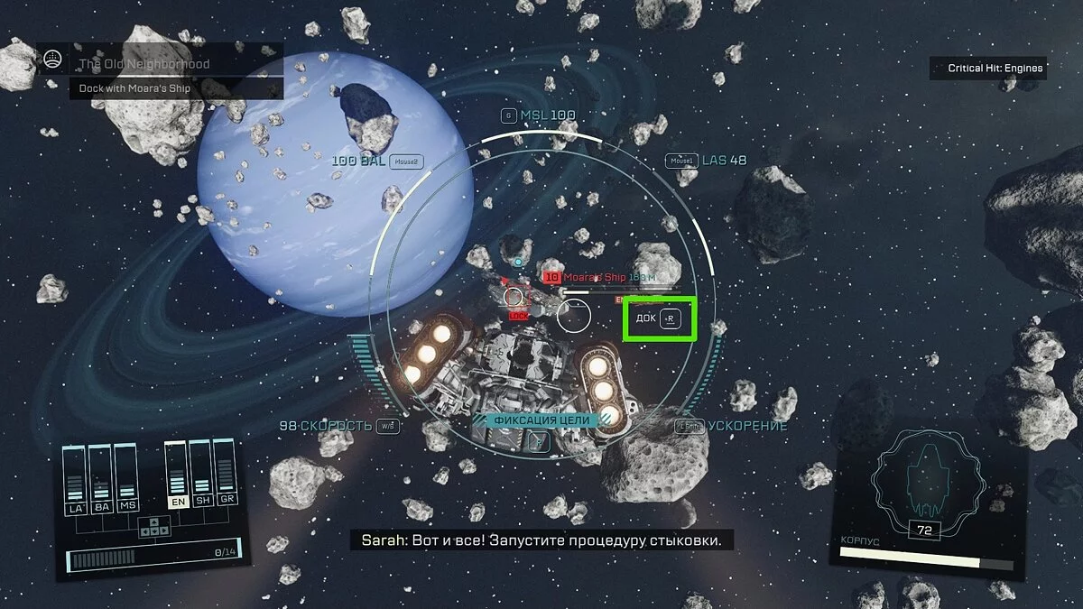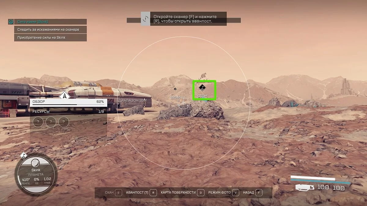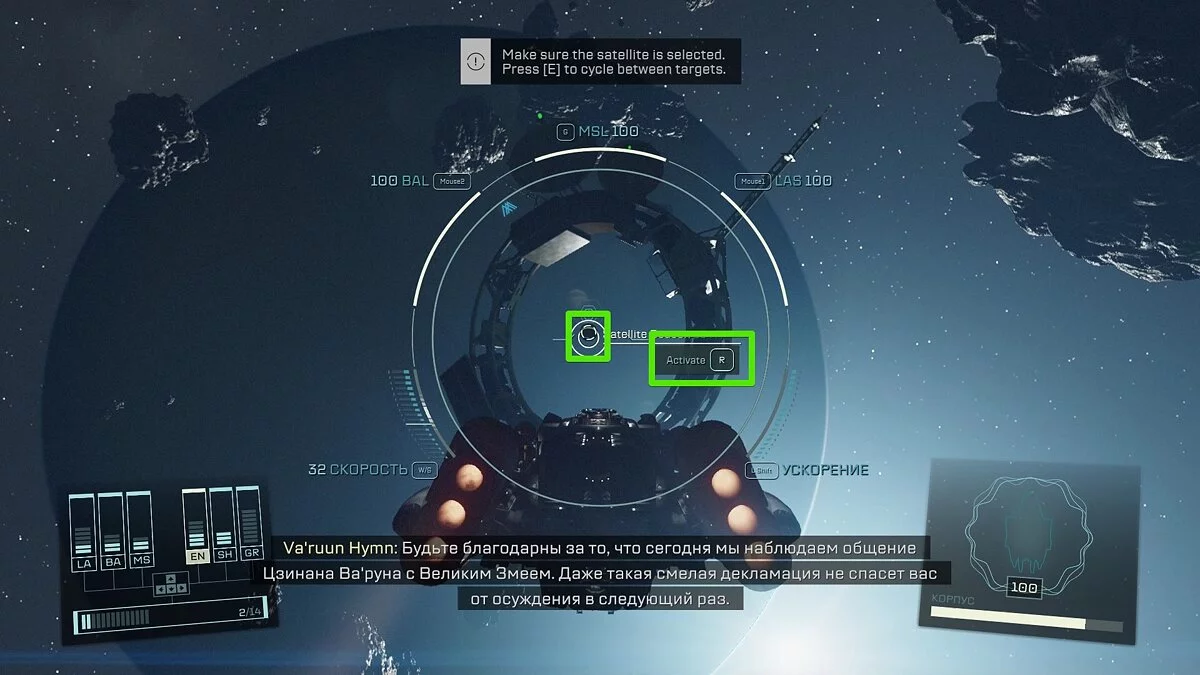 Приземляться на неё не стоит — нужно подлететь вплотную к спутнику, курсирующему неподалёку, и активировать его. Направьте курсор на выделенную область, затем нажмите «E». Теперь зажмите клавишу «R» для активации.