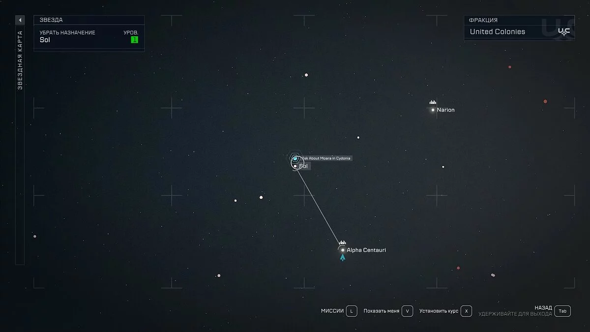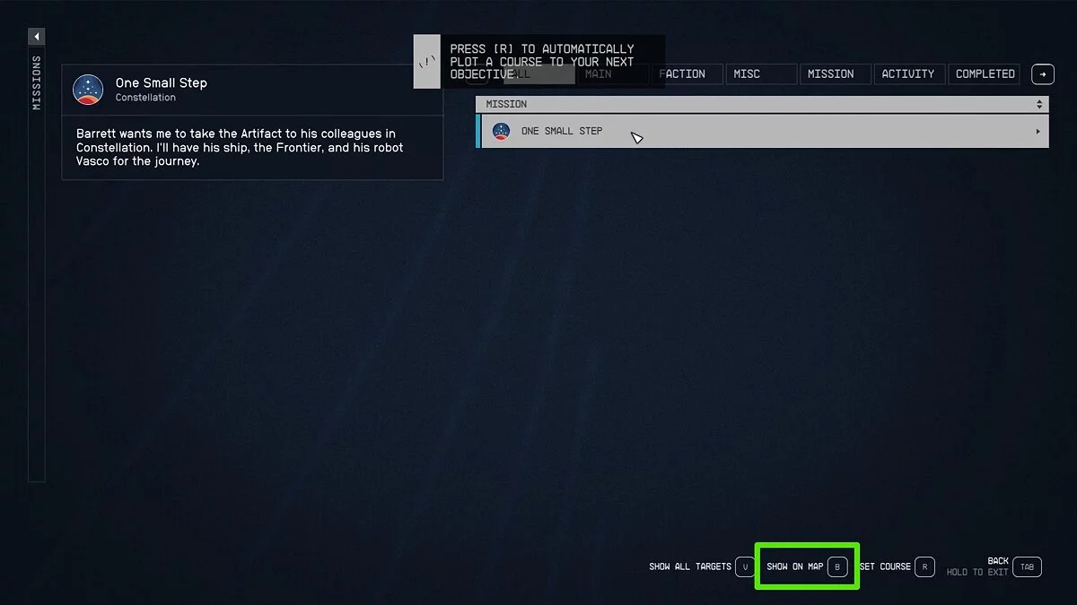 Совет: чтобы отследить цель задания на карте, откройте журнал задач (L), наведите курсор мыши на название квеста и нажмите «B». В этот момент откроется карта, а вы сможете совершить прыжок или задать курс для корабля (в зависимости от расстояния до планеты или объекта, к которому совершается перемещение).